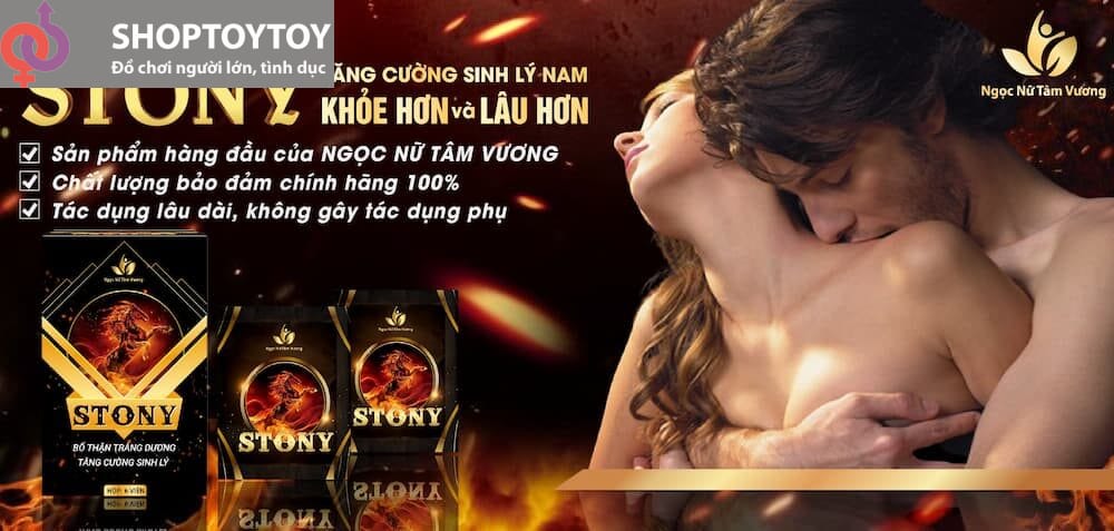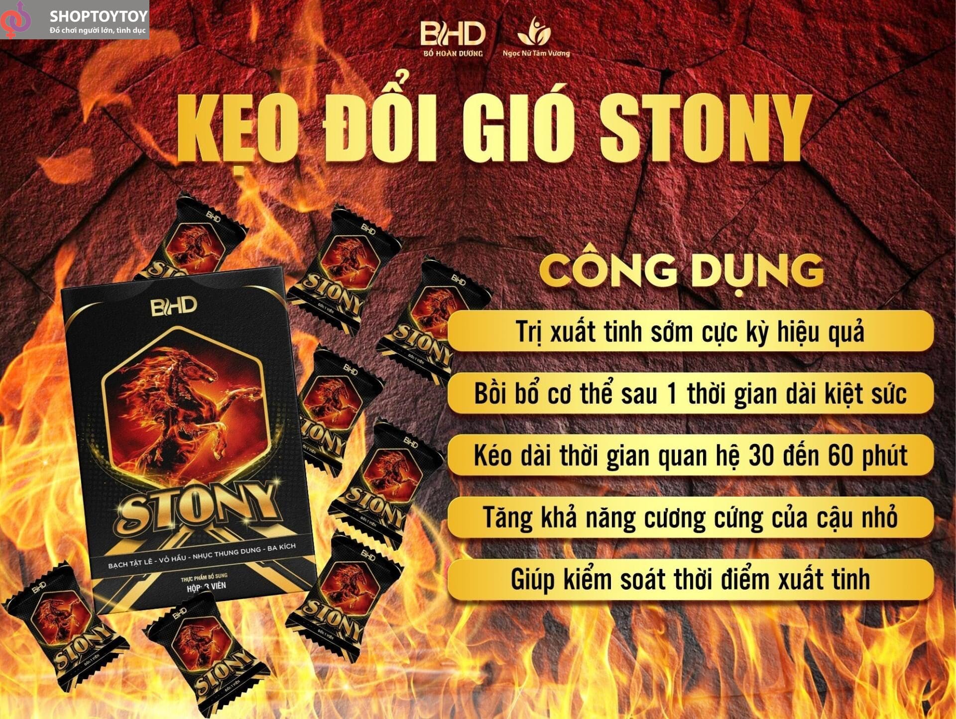 Theo thông tin từ hãng, kẹo ngậm Stony được nghiên cứu với công thức riêng nhằm bồi bổ sức khỏe, tăng cường sinh lý nam giới, cân bằng nội tiết tố và giảm các chứng rối loạn tình dục thường gặp như: xuất tinh sớm, rối loạn cương dương, mộng tinh, giảm ham muốn,…